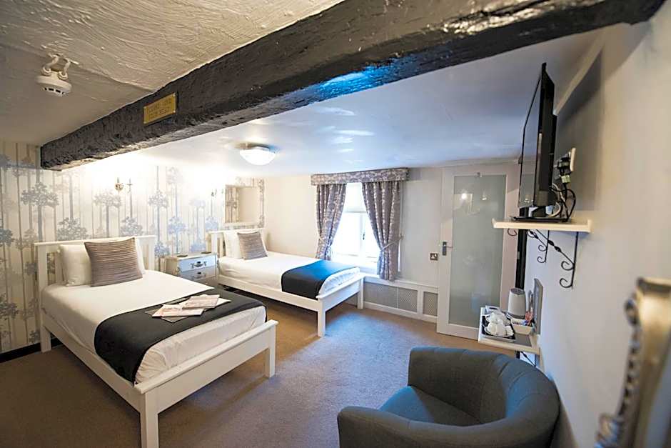 The Deluxe Family Suite features the largest bathroom within The Pied Bull, which includes a feature fireplace and a roll top bath.